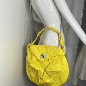 This is a beautiful Marc by Marc Jacobs Yellow Patent Leather Turnlock Flap Crossbody Hobo Bag. Shows some marks and scuffs from normal wear. Overall excellent condition. Purposely lightly crinkled leather. Looks super cool.