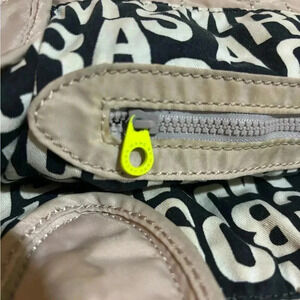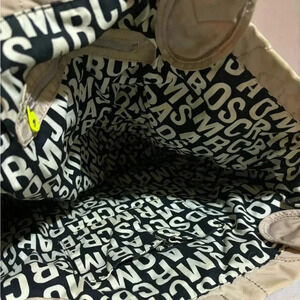 Marc by Marc Jacobs beige nylon handbag main compartment 3 pockets at interior wall 1 zip closure fabric lining logo at front lining & exterior have have some stains marks hight 9” width 20” depth 6” strap drop 9”