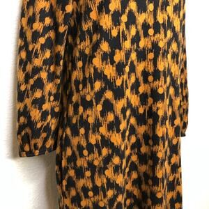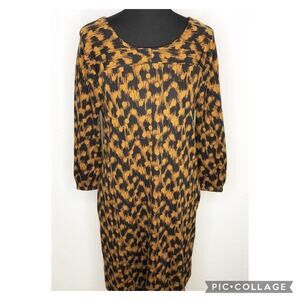 Marc by Marc Jacobs black golden brown graphic print shift dress. Round neckline. Midlength sleeves. Double side pockets. Zips at back neckline. Size Medium. Excellent preowned condition. Minor wash wear.