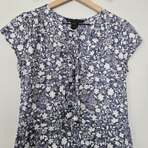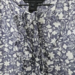 Marc by Marc Jacobs shift dress. Blue and white flowers. Cap sleeves. V neck with neck tie and ruffles. Lined. Side zipper.