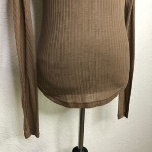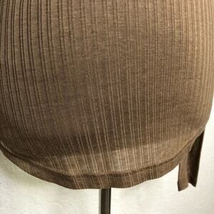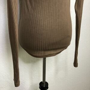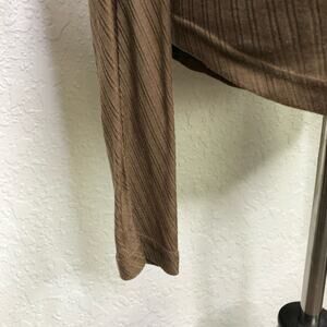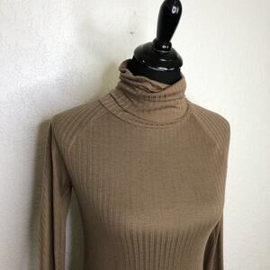 Marc by Marc Jacobs brown ribbed knit silk blend turtleneck top. Pullover style with turtleneck neckline. Lightweight tissue ribbed knit. Curved hemline. Size Small. Excellent preowned condition. Minor wash wear.