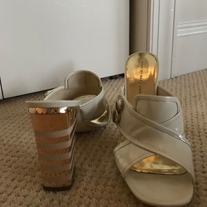 Marc by Marc Jacobs ivory patent mules with gold striped heel. Only worn twice. 4 inch heel. Euro 39.5 fits more like a 8.5. No box.