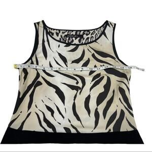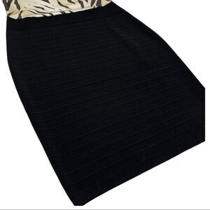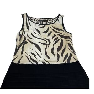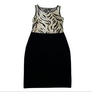 Size N1 (equivalent to size 4). Midi length sleeveless dress. Solid black skirt featuring beige and black zebra animal print top. Sleeveless and round neck. Stretch body con design. 75% viscose/25% nylon. New with tags
