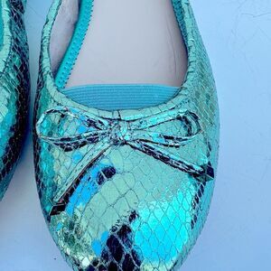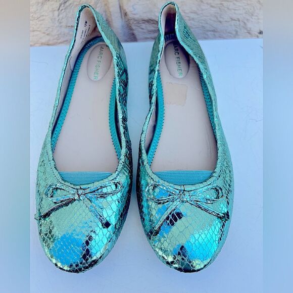 Comfortable and in style is this pair of Marc Fisher women's metallic aqua blue ballet flats. Like pretty presents for your feet, these Marc Fisher flats are topped with a bow. It's ok if you do a little happy dance every time you wear them. In great preowned condition. Size 10