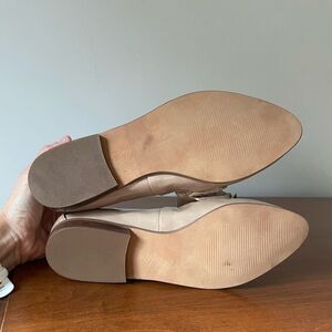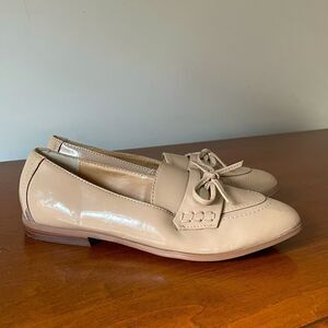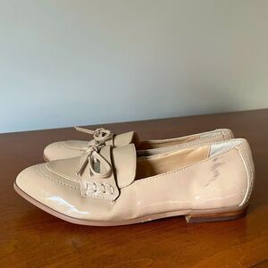 Marc Fisher cream/nude patent leather Moccasin style loafers. Almond toe. Genuine leather. Cushioned footbed. One scuff on left shoe as seen in photos. Seems like it could be buffed out.