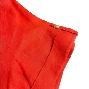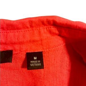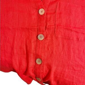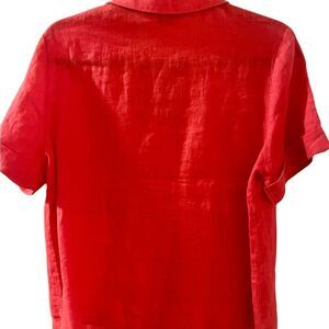 Red linen short sleeve blouse, collar, button up. S: Medium, pit to pit: 21”, length: 23”.