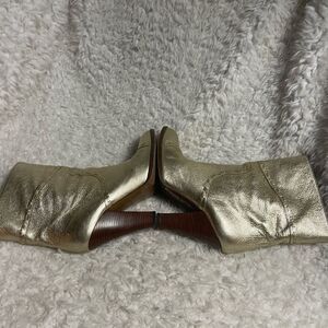 Marc Jacobs leather metallic gold slip on ankle heels boots stitching accent SZ7. Pre owned in good used condition signs of wear on the outer soles see all pictures any questions please message.