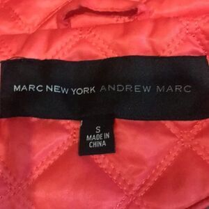 Women’s quilted puffer jacket by Marc New York Andrew Marc. This coral colored coat has a zipper front, zipper pockets, and a stand up collar. It is 100% polyester.
