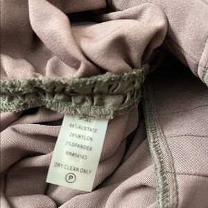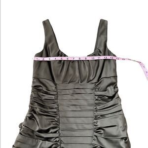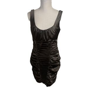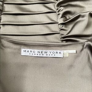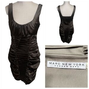 Marc New York Ruched Dress. Features ruched detailing through. Fitted. Color is olive green. Side zipper. Generous stretch to material. Unlined.