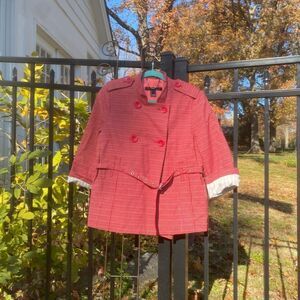 Beautiful mbmj red tweed jacket. Never been worn, with tags attached. Double breasted. Belted. Comes with extra buttons. Pink lining.