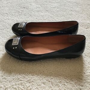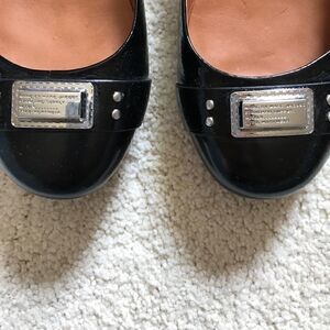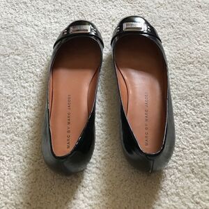 Marc by Marc Jacobs flats. Black patent leather with silver Marc Jacobs logo. Patent leather with shiny appearance. Only worn once so they are in very good condition. Willing to negotiate prices!
