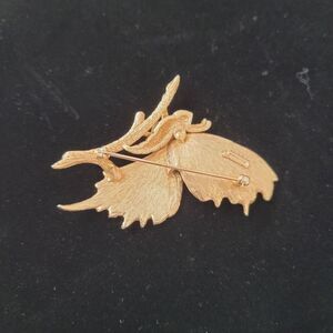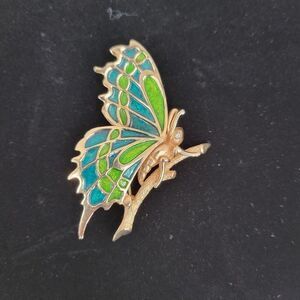 Stunning gold toned 2D Butterfly Broch with green and blue enamel and rhinestone eye. Just under 3"