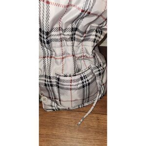 Hooded puffer vest has zippered and button closure drawstring waist can be cinched.2 exterior pockets torn lining see photos easy repair. 25" armpit to armpit 25" long