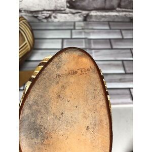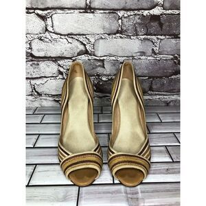 Selling Marcello Toshi Gold Brown Stripe Fabric Peep Toe 5” High Heels Women Sz 6M US/37EU