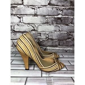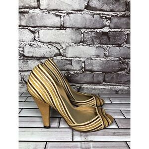 Marcello Toshi Gold Brown Stripe Fabric Peep Toe 5” High Heels Women Sz 6M US/37