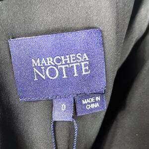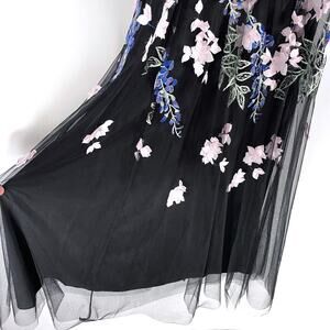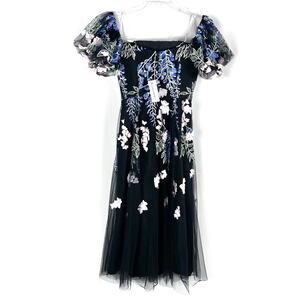 Marchesa Embroidered Tulle Midi Dress Black Blue 3D Floral Off Shoulder Sz 0