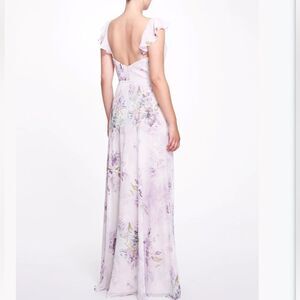 Marchesa Lilac Floral Chiffon Gown with Ruffle Cami Straps and Waist Tie Sz 0