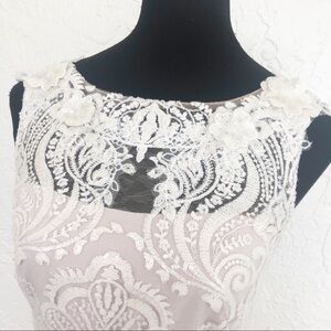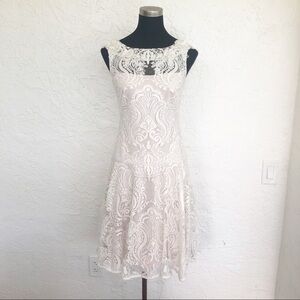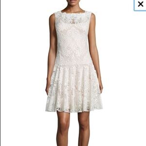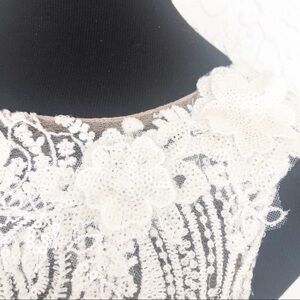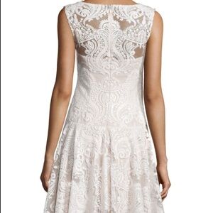 Marchesa Notte Bridal Wedding Ivory Lace Drop Waist Cocktail Dress. This beautiful dress could be worn for so many special occasions. Bridal, wedding, rehearsal dinner, bachelorette, the possibilities are endless. Gorgeous lace detail with sequins and embroidery. White embroidered flowers on illusion mesh neckline. Intricate back.