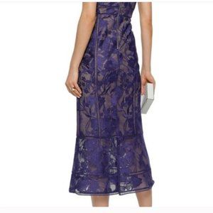 A flawless silhouette with intricate lace detail and a floral embroidered design. This tea length dress by Marchesa Notte radiates refined elegance. We love to pair it with a black clutch to complete the modish attire.