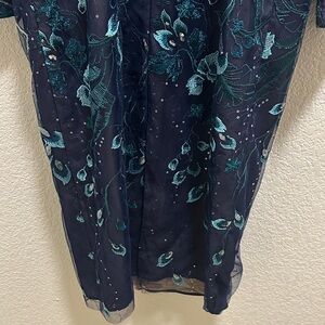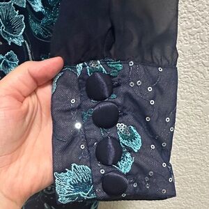 This chic long sleeve dress features beautiful teal floral patterns on a classic black base. Perfect for adding a touch of elegance to any event.