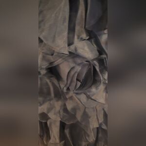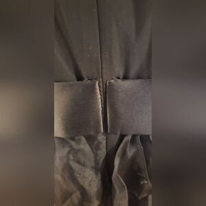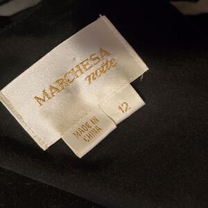 Black Marchesa silk dress with ruffles throughout, floral belt accent at waist and concealed zip closure at center back.