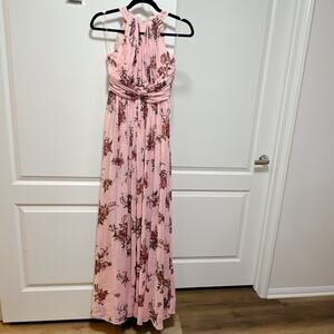 Elegant and romantic, this blush floral halter gown from Marchesa Notte is designed in airy chiffon with a flowing full-length silhouette. The pleated bodice features a flattering halter neckline with an open back and fitted waistband. Made from 100% polyester chiffon with a hidden back zipper closure. Measures approximately 58" from shoulder to hem. The neck buckle has been professionally reinforced. In excellent condition with no visible flaws—perfect for weddings, formal events, or evening galas.