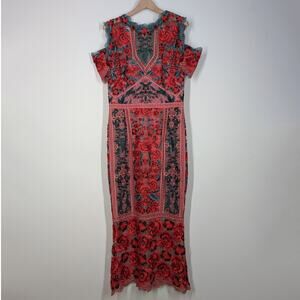 Marchesa Notte Carmelita Red Pink Floral Lace Midi Dress Cold Shoulder Size 8
