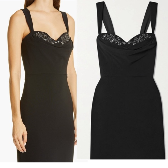 Marchesa Notte Crystal Embellished Cowl Neck Crepe Sheath Cocktail Midi Dress