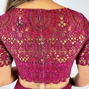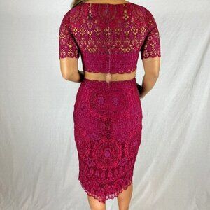 Gorgeous luxury designer Marchesa Notte - deep red lace with embellishments on the top, nude mesh panel at the waist, and lined skirt with eyelet lace