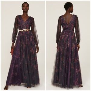 Marchesa Notte Floral Print Sheer Panel Gown SALERNO Sz 0 Purple Bridesmaid Plum