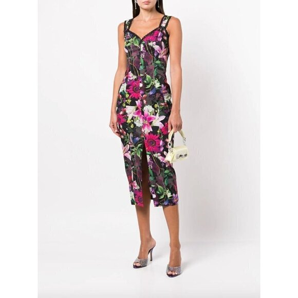 A vibrant botanical print refreshes this Marchesa Notte midi dress styled with a flattering sweetheart neckline and center slit.