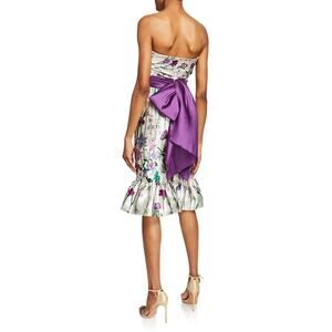 Marchesa Notte Floral Strapless Mikado Dress in Cream. Size 2. Features strapless, floral print, back bow detail, ruffle hem, hidden back zipper closure, back slit, satin fabric, and midi length. Body: 100% Polyester. Contrast: 85% polyester, 15% Silk. Lining: 100% Polyester. Thread snag near neckline.