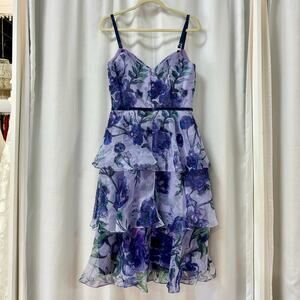 Marchesa Notte Floral Tiered Twist Front Tea Length Dress Organza Lilac US 4