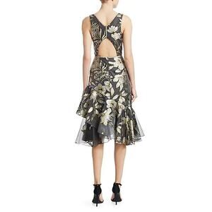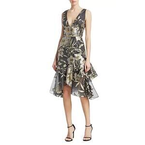 Marchesa Notte Gold Metallic Floral Print Asymmetrical Flounce Cocktail Dress 6