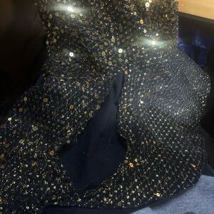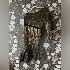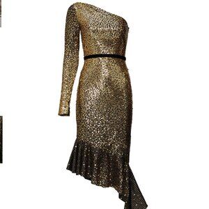 Gold and black sequin knit (85% Nylon 14% Metallic). Sheath. Long sleeves. One shoulder neckline. Hidden side zipper with hook-and-eye closure. Fully lined. 46" from shoulder to lowest hemline.