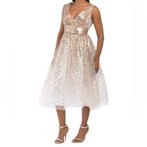 Marchesa Notte Gold Sequin V Neck Midi Dress Size 4 Luxury