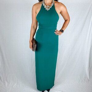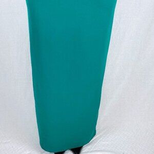 Green crepe (100% Polyester). Hidden back zipper with hook-and-eye closure. Fully lined.