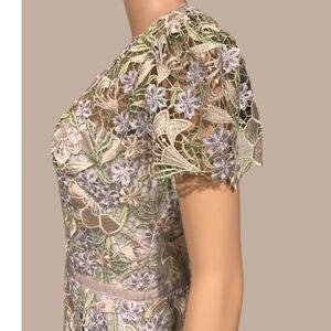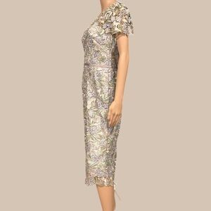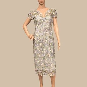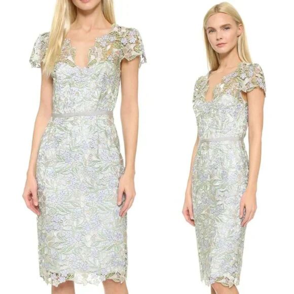Marchesa Notte Ice Bell Bloom Sheath Crochet Overlay Dress Muted Blue Sz 8