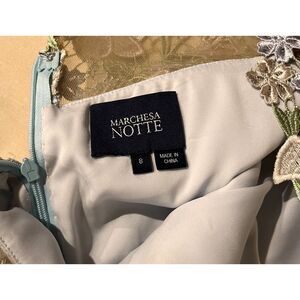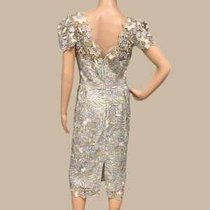 Feminine and floral, this muted blue Marchesa Notte sheath is understatedly charming.