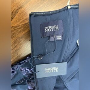 Marchesa Notte Lotus Sequin Midi Dress Size 2 Navy Formal Elegant Party Evening