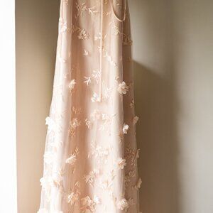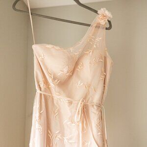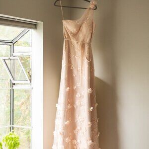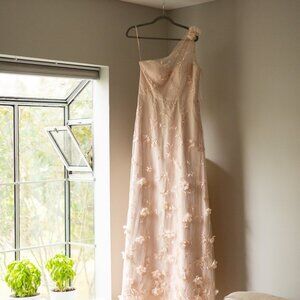 Marchesa Notte one-shoulder bridesmaid's gown in powder pink, with floral appliqué. Size 6. Worn only once to my best friend's wedding and dry-cleaned.
