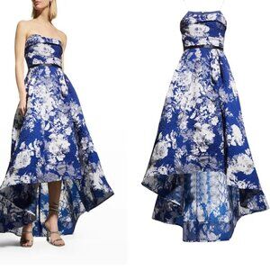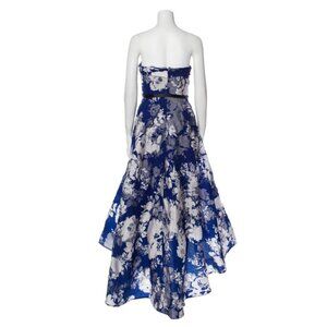 Strapless organza cloque hi-low gown with ruched bodice. Blue and white floral jacquard print. Back zip. Pockets.