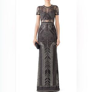 The mosaic design and intricate mesh detail on this Marchesa Notte gown masters elegance and makes a royal entrance. We love to style it with the Black Fiona Minaudiere by Inge Christopher to further the statement look.