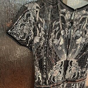 Silver mesh (100% Nylon). Gown. Short sleeves. Crew neckline. Hidden back zipper with hook and eye closure. See size and fit tab for length. Imported.