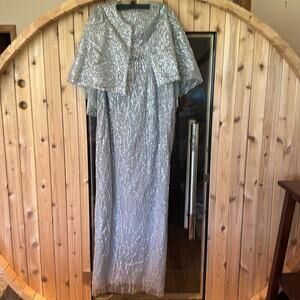 Sleeveless and comes with a shoulder wrap/cape that closes via hook