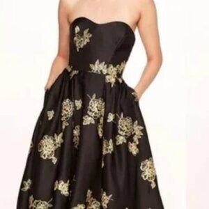 Description: Strapless black evening dress with gold embroidery