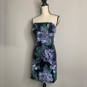 This dress is a striking strapless mini dress that combines elegance with a bold, botanical-inspired pattern.