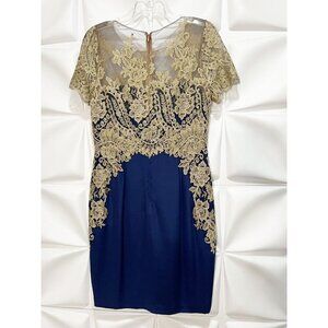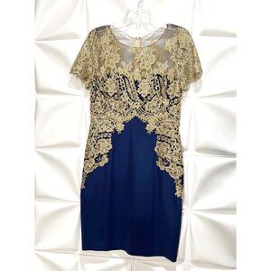 Brand new with tags! Size 10. Navy Blue/Gold type colors. Body is 95% Silk/5% spandex. Combo 1 & 2 is Nylon. Polyester/spandex lining. Upper is mesh with gorgeous embroidery and beaded detail. Silk dress goes up to neck line with a sweetheart type neckline and then the mesh continues up so everything above neckline is sheer mesh with the embroidery/beaded detail for an illusion style detail. Back zip closure. Super rare and impossible to find anywhere! Lovely!