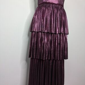 Marchesa Notte pleated tiered metallic purple evening cocktail dress 8. The boning in the top needs to either be removed or readjusted into place as one spot seems to have slipped inside, also has a few dark spots where the metallic is worn on the bottom front (see photos)
