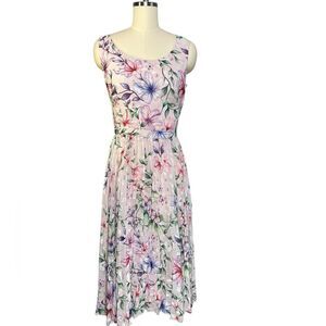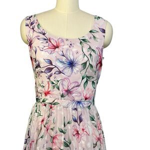 Blush floral chiffon sleeveless midi dress. Scoop neck, fit and flare, fully lined. Fabric has a bit of shimmer. Back zipper with bow closure at the neck. A PERFECT spring dress with a bit of shimmer!